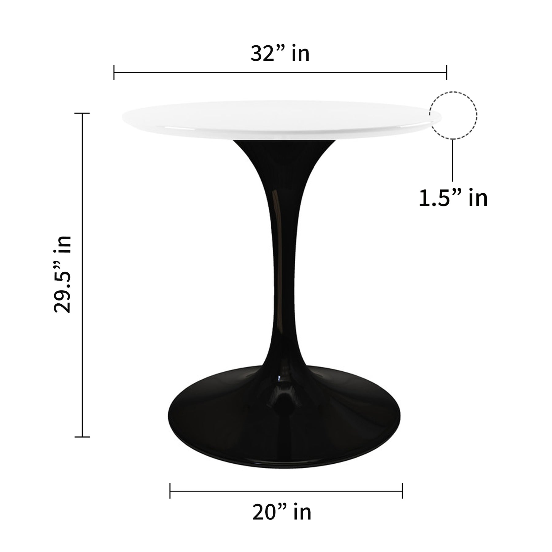 Give your space a modern twist with this 32" fiberglass dining table featuring a white top and a black base. The compact size and sleek finish make it a versatile option for small dining areas, cozy breakfast spots, or stylish home offices. White fiberglass top with a black pedestal base has a heat, stain, and scratch-resistant glossy finish. Its compact size fits 2 to 3 diners comfortably. Gives sturdy pedestal construction for open seating and strong support. Great for minimalist or monochrome decor themes. A balanced, two-tone table that delivers everyday ease with refined contrast.