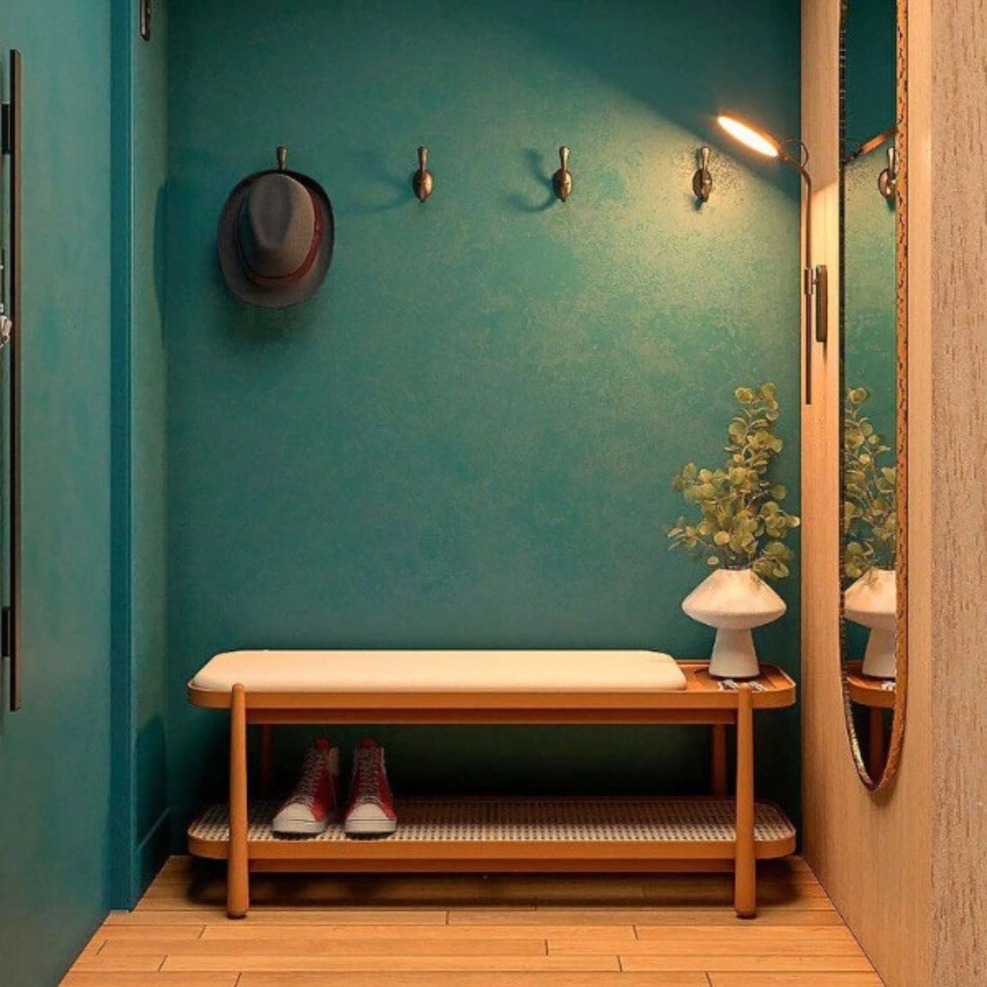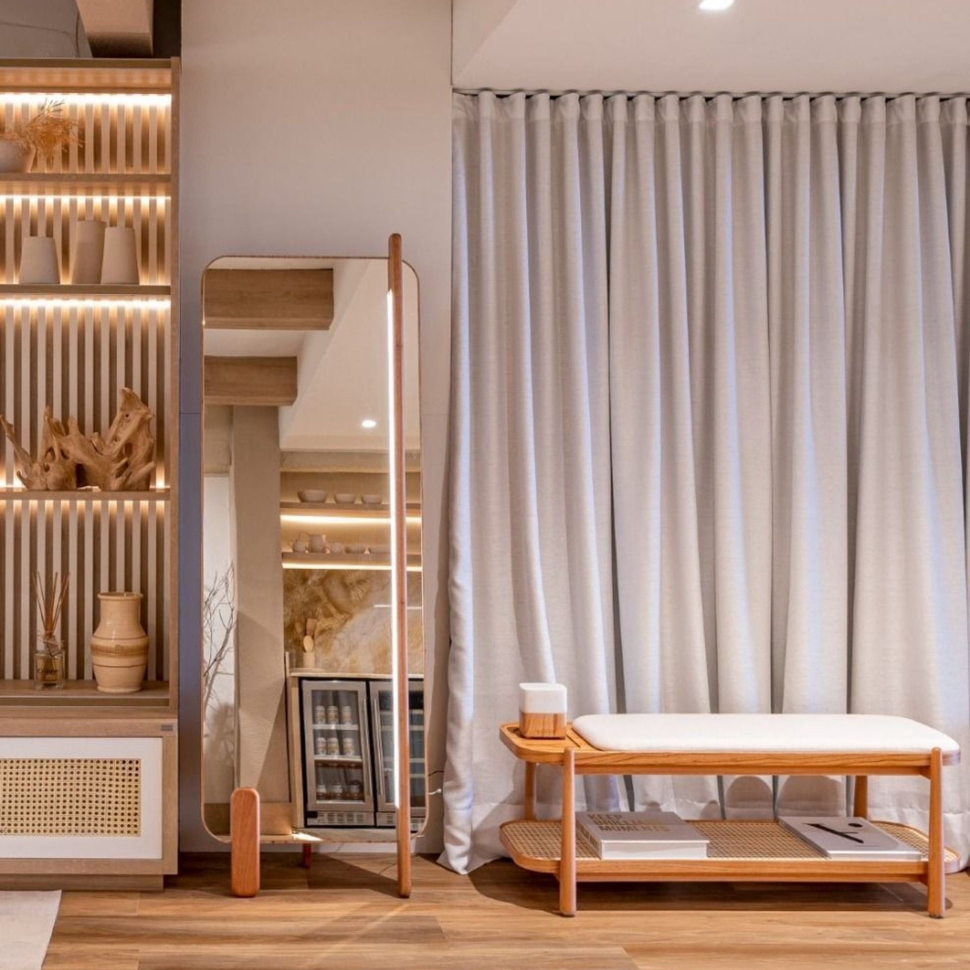 The Lorren Bench is one of those pieces that feels thoughtfully made the moment you sit down. Its solid eucalyptus wood frame gives it a sturdy, grounded presence, while the ergonomically shaped seat, padded with high-density foam and wrapped in soft, premium upholstery, is just comfortable enough to linger on.