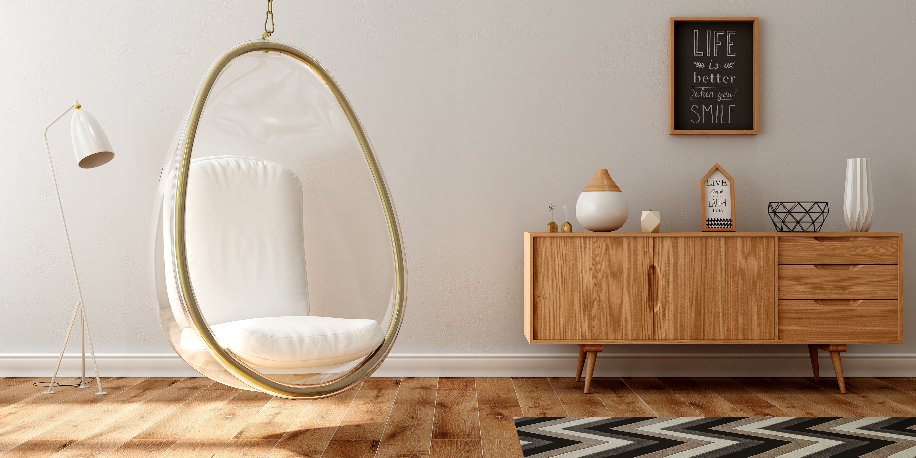 - The Scoop Hanging Chair is crafted from a reinforced acrylic shell that combines durability with a light, airy look.