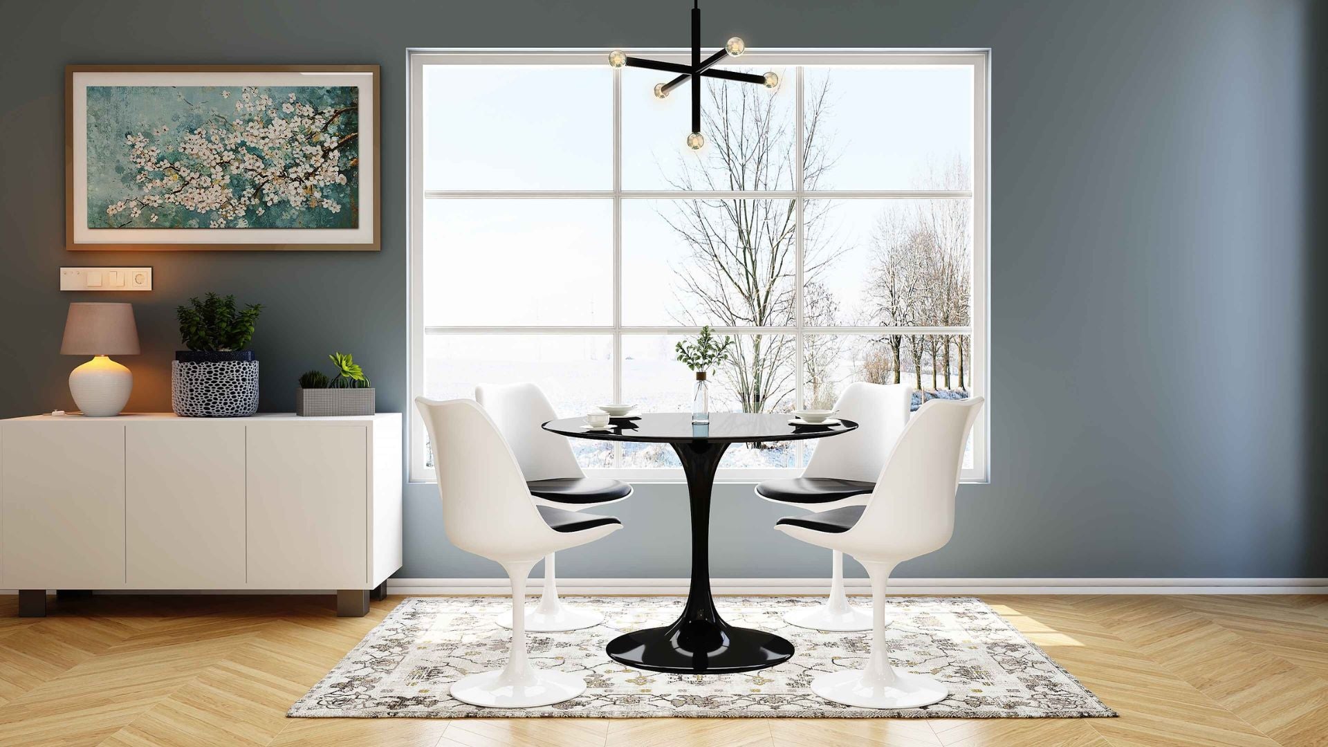 This all-black 42-inch fiberglass dining table brings a sleek, modern edge to your dining space. Designed with a clean round top and solid pedestal base, it offers a minimal yet bold statement that fits in kitchens, dining rooms. Built from durable fiberglass, the glossy surface is resistant to everyday wear while offering a smooth finish that’s easy to maintain. Comfortably seating 4 people, the one-piece pedestal base provides stability and legroom. Its a striking centerpiece for those who prefer a darker, more dramatic dining look, without sacrificing practicality.
