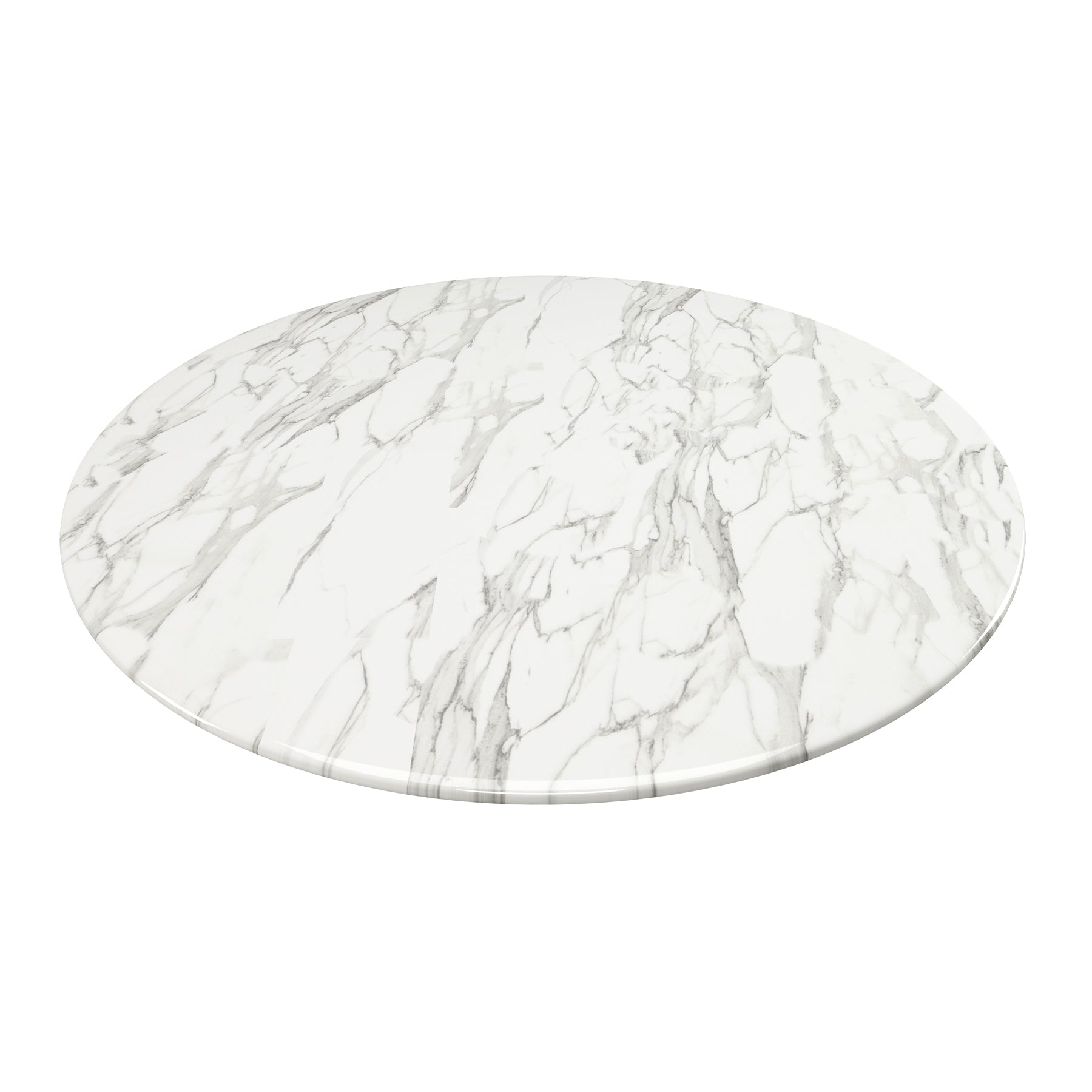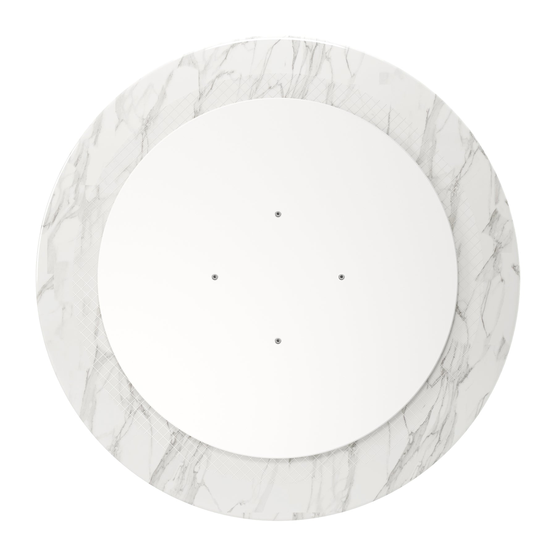 - The tabletop is made from 1-inch thick, solid artificial marble with natural veining sealed with a transparent gloss coating supported by a heavy one piece seamless lacquered metal base complementing the table top.