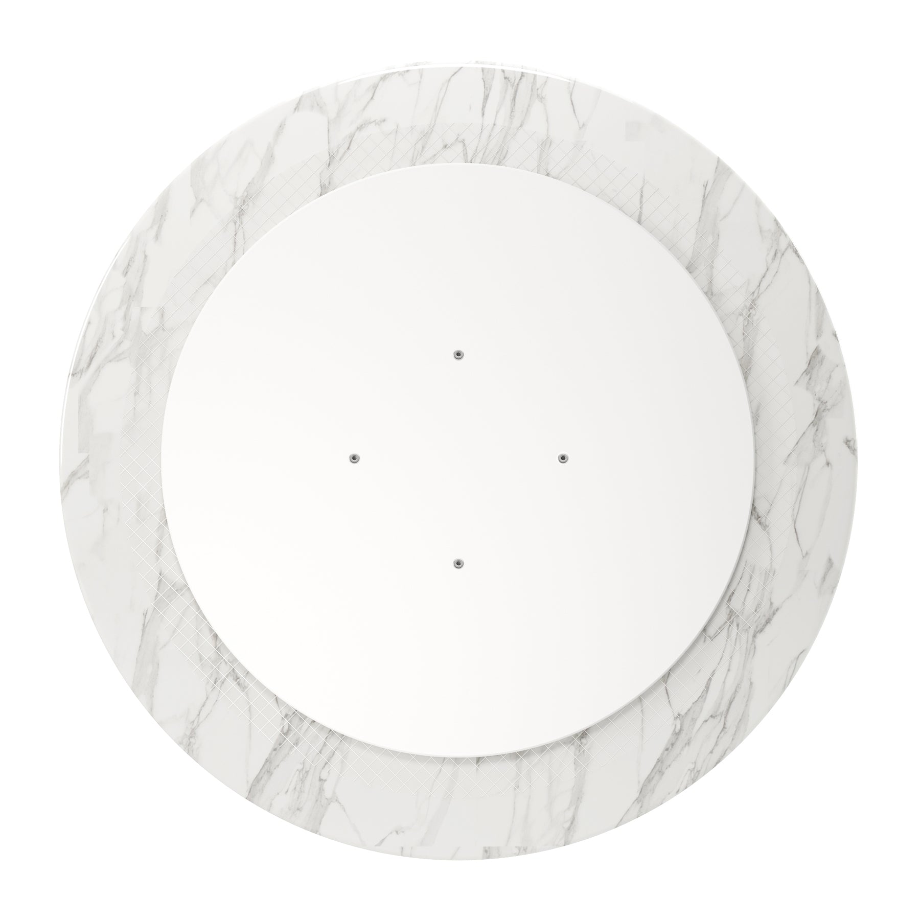 - The tabletop is made from 1-inch thick, solid artificial marble with natural veining sealed with a transparent gloss coating supported by a heavy one piece seamless lacquered metal base complementing the table top.