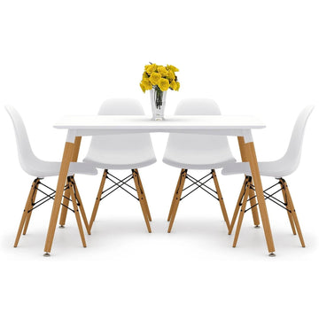 Bring energy and modern style to your space with the Vincent Dining Table and Eiffel Side Chair set. Designed for real-life gatherings, whether it's casual dinners, weekend brunches, or creative work sessions, this set pairs a sleek, glossy white tabletop with sculptural seating that stands out. The Vincent Table features a lightweight yet durable fiberboard top and solid beech wood legs for everyday stability. Its clean rectangular surface offers plenty of room for meals, laptops, or conversation starters.